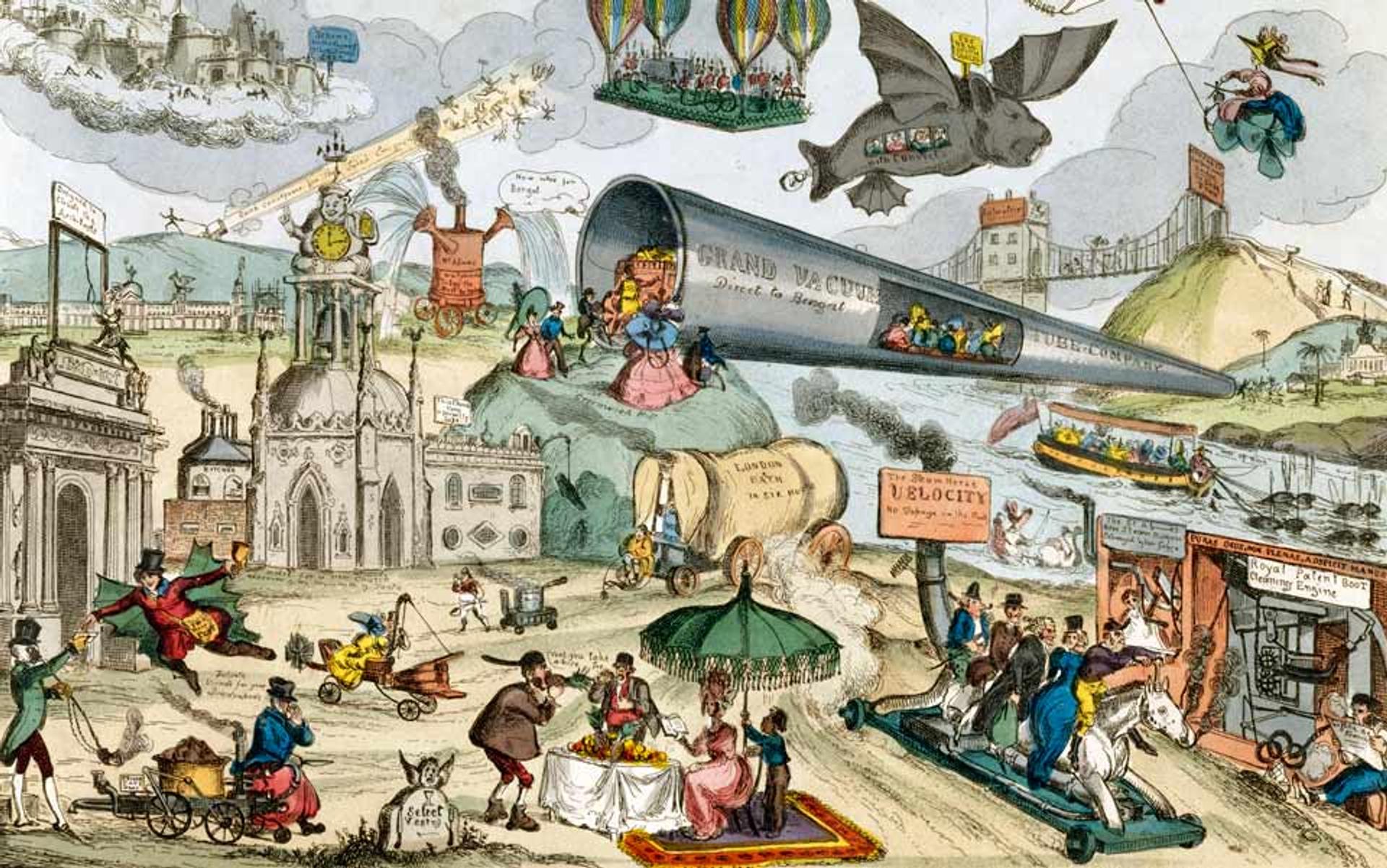 Током раних деценија 19. века, постале су популарне сатиричне графике са насловима као што је "Марш интелекта" (March of Intellect). Ове карикатуре приказивале су футуристичке сцене испуњене невероватним машинама, попут парних машина у облику коња, или цевима попут "Велике вакуумске цевне компаније: директно за Бенгал" за ултра-брзи превоз путника. Иако су биле сатира, чија је сврха била исмевање нереалних обећања технолошког напретка, њихова популарност указује на изненадну свеприсутност новог начина размишљања о будућности као продукту технолошких иновација. Ове визије, иако данас делују фантастично, често су имале стварну основу у савременим плановима, попут пнеуматских железница.